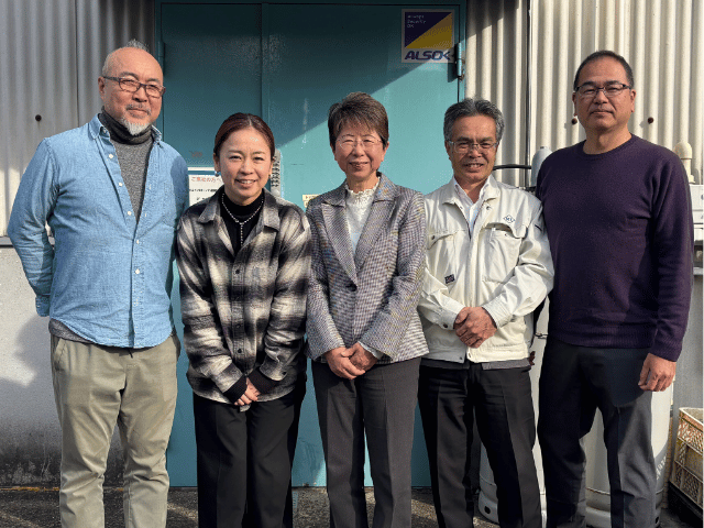 ▲写真左から:桐山工業 品川様/牧様、株式会社塩原製作所 代表取締役 塩原 透様、WILLTEX 上田